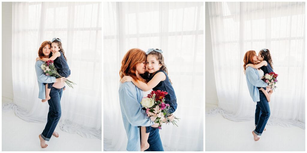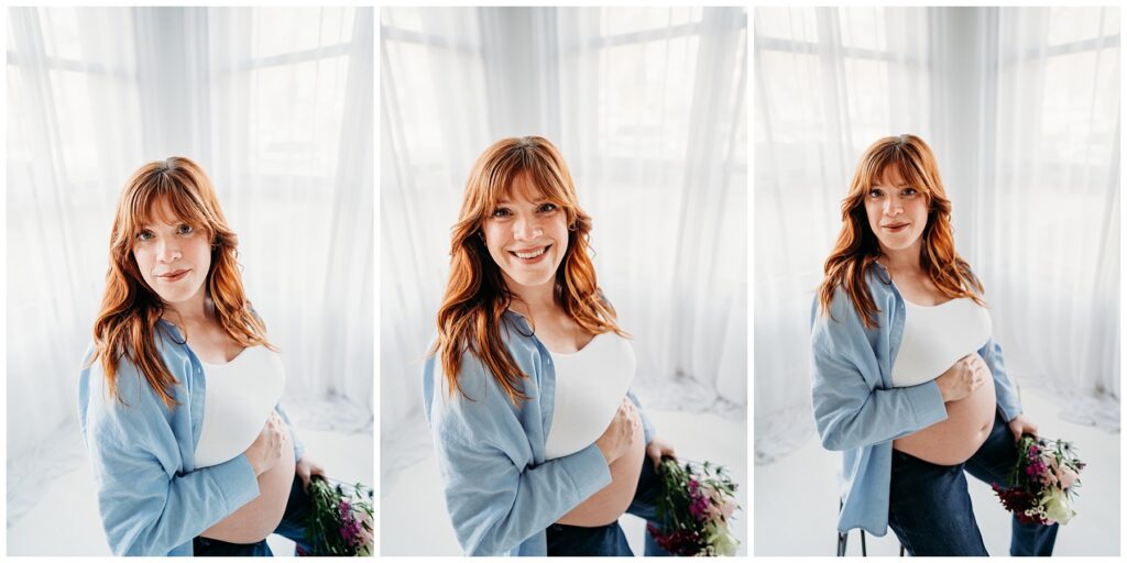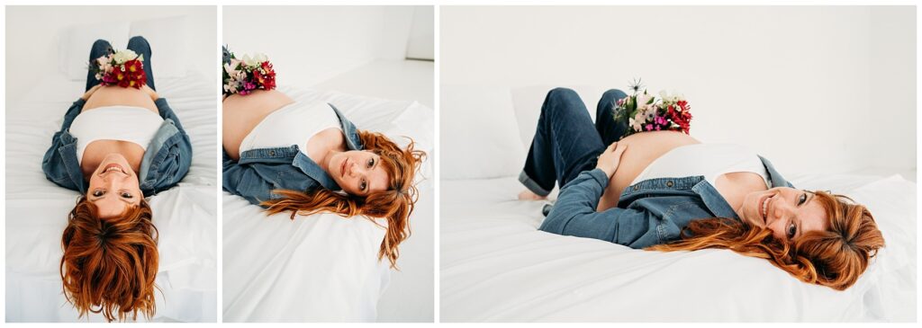To bring in a little extra color and texture, mom added a bouquet of flowers that stood out beautifully against the simplicity of the studio and the denim tones. It was the perfect detail-soft, vibrant, and just enough to add a pop without taking away from the clean, editorial feel she envisioned.